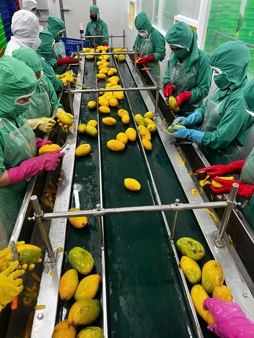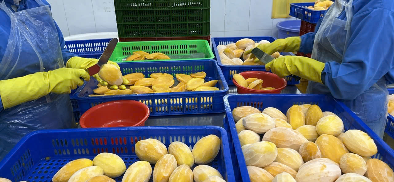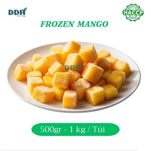 Sản phẩm: Xoài tươi được lựa chọn từ những vùng trồng đạt chuẩn, sơ chế và cắt thành khối vuông 2cm x2cm, cấp đông nhanh để giữ nguyên màu sắc, hương vị và giá trị dinh dưỡng.